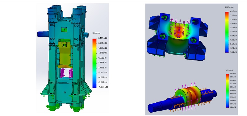 威榮精鍛的產(chǎn)品,以清華大學(xué)教材《曲柄壓力機(jī)》和《熱模鍛壓力機(jī)》為設(shè)計(jì)參考,吸取國內(nèi)外優(yōu)秀機(jī)型的優(yōu)點(diǎn)進(jìn)行設(shè)計(jì);在設(shè)計(jì)完成后,通過計(jì)算機(jī)有限元分析,模擬出各個(gè)關(guān)鍵點(diǎn)的位移變量,皆優(yōu)于同類型機(jī)型,整體剛性更是高于標(biāo)準(zhǔn)近3倍。在制造完成之后,還要通過噸位達(dá)標(biāo)測(cè)試和剛性檢驗(yàn)才可出廠驗(yàn)收,保證能力足夠大,機(jī)身足夠硬。